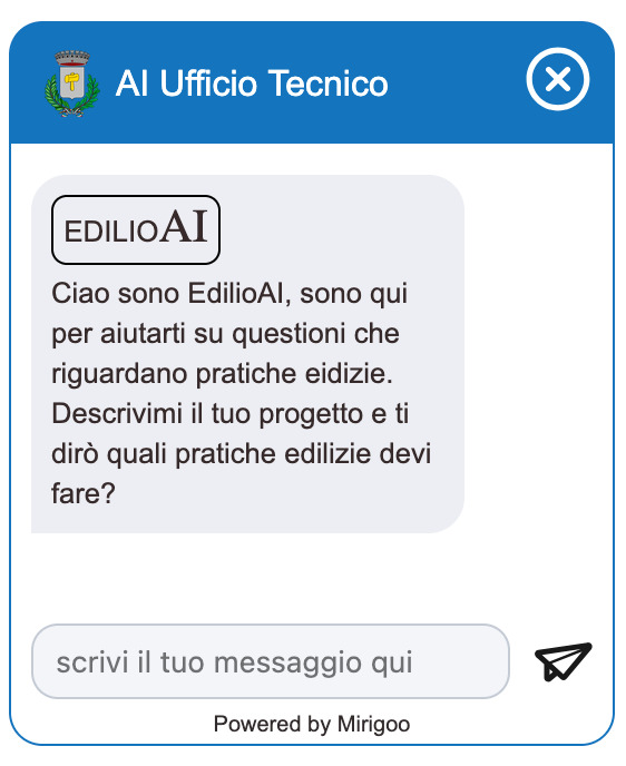EdilioAI è un chatbot intelligente che si integra nella sezione “Progetti Edilizia” del sito comunale. Conversa in linguaggio naturale, guida l’utente alla pratica corretta e spiega, passo dopo passo, documenti e adempimenti da presentare.